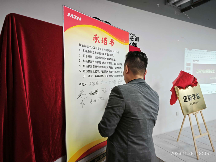 與會人員一起宣誓和簽字承諾,倡導公司上下所有同事,積極參與邁騰的授課、學習、互動等,為邁騰電子的發展全力以赴、用邁騰學院的平臺為自身職業發展賦能。