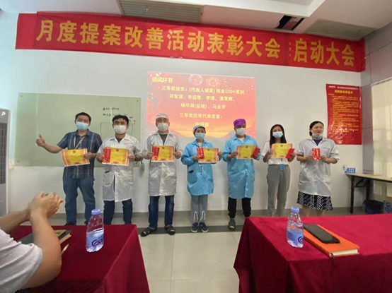 3月份,共收到員工提出172項提案,經各評審小組審核評選,最終角逐出一等獎1名,二等獎3名,三等獎6名,評審小組成員分別為優秀提案改善項目人員頒發榮譽證書、獎金,并合影留念。