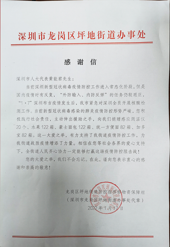 在“0107”新冠疫情發生以來,作為總部位于深圳市龍崗區的本土企業,邁騰電子主動踐行社會責任,深圳市人大代表,邁騰電子有限公司總經理黃能君積極參與和支持深圳市疫情防控工作。1月17日,公司向位于深圳市龍崗區坪地街道坪西社區捐贈生活物資與防疫物資,為社區疫情防控盡綿薄之力。