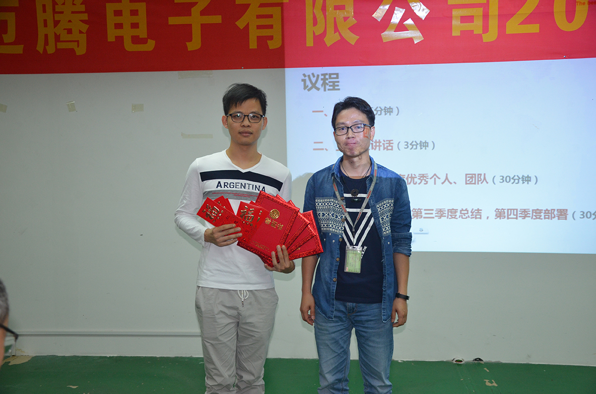 大會(huì)的結(jié)尾,黃總為營(yíng)銷(xiāo)中心總監(jiān)歐總和產(chǎn)品線魏經(jīng)理,準(zhǔn)備了一件特別的禮物并親自頒發(fā),勉勵(lì)他們繼續(xù)發(fā)揚(yáng)標(biāo)桿和榜樣的力量,并希望全體邁騰人認(rèn)真學(xué)習(xí)他們的先進(jìn)事跡,進(jìn)一步加強(qiáng)個(gè)人能力及團(tuán)隊(duì)協(xié)作能力,不斷滿足客戶(hù)需求,為實(shí)現(xiàn)邁騰電子成為世界一流的研發(fā)、制造廠商而努力